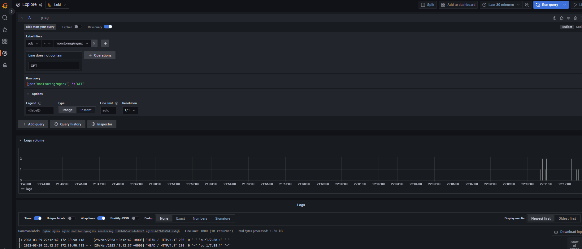 172.30.90.113 - - [29/Mar/2023:13:12:42 +0000] "HEAD / HTTP/1.1" 200 0 "-" "curl/7.88.1" "-"