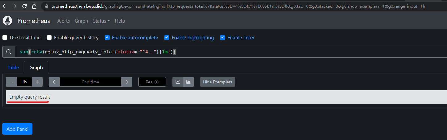 - nginx_http_requests_total{status=~"^4.."} 정규 표현식 사용시 안나오는 것 확인