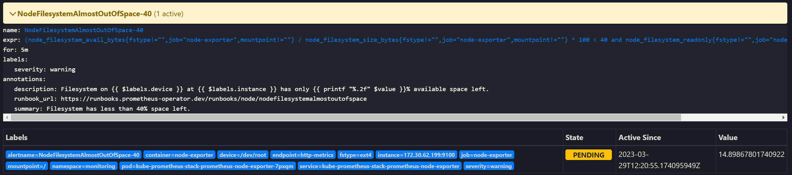 - alert: NodeFilesystemAlmostOutOfSpace-40