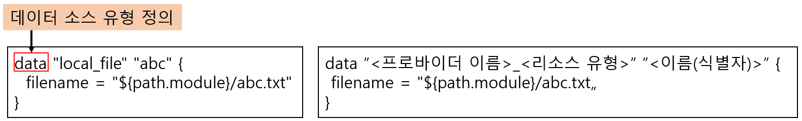 - 이름 뒤에는 데이터 소스 유형에 대한 구성 인수들은 { } 안에 선언한다.