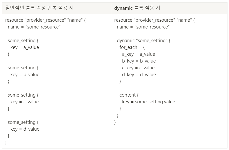 - 리소스 내의 블록 속성(Attributes as Blocks)은 리소스 자체의 반복 선언이 아닌 내부 속성 요소 중 블록으로 표현되는 부분에 대해서만 반복 구문을 사용해야 하므로, 이때 dynamic 블록을 사용해 동적인 블록을 생성 할 수 있다.