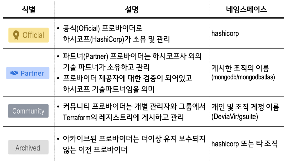 - 네임스페이스 : 지정된 레지스트리 내에서 구분하는 네임스페이스로, 공개된 레지스트리 및 Terraform Cloud의 비공개 레지스트리의 프로바이더를 게시하는 조직을 의미