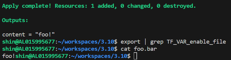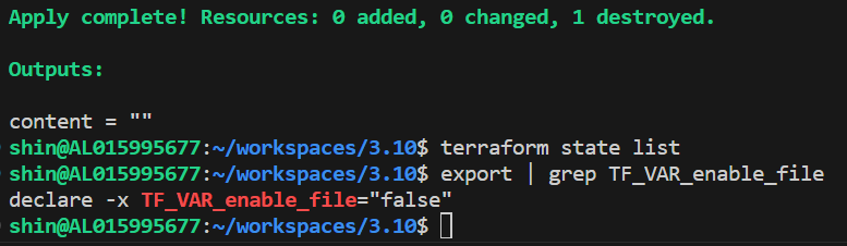 TF_INPUT : 값을 false 또는 0으로 설정하면 테라폼 실행 시 인수에 -input=false 를 추가한 것과 동일한 수행 결과를 확인