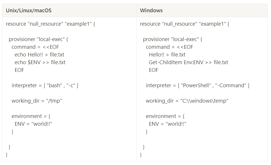 - 리눅스나 윈도우 등 테라폼을 실행하는 환경에 맞게 커맨드를 정의, 아래 사용하는 인수 값
