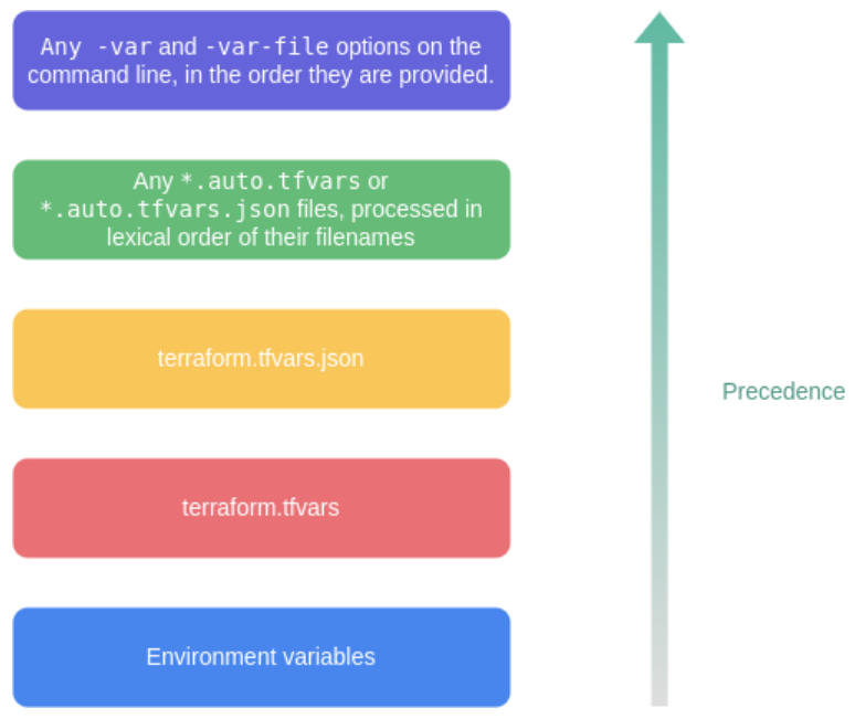 - 선언되는 방식에 따라 변수의 우선순위가 있으므로, 이를 적절히 사용해 로컬 환경과 빌드 서버 환경에서의 정의를 다르게 하거나, 프로비저닝 파이프라인을 구성하는 경우 외부 값을 변수에 지정할 수 있다.